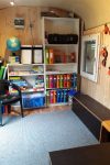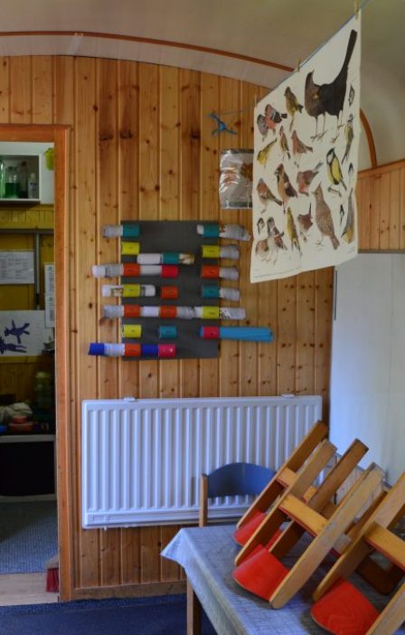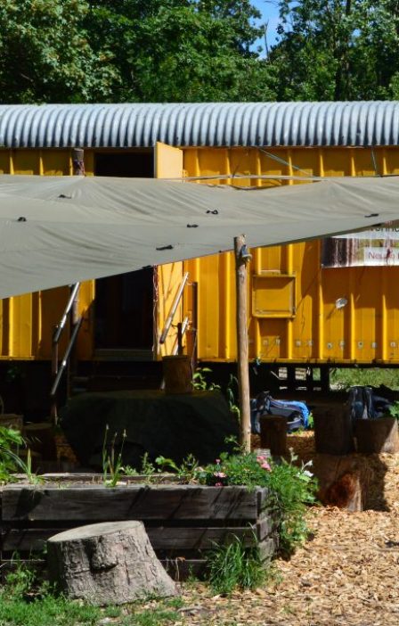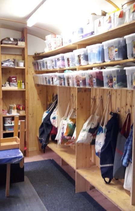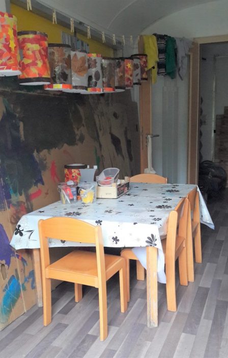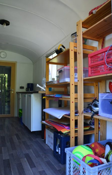Der vierte Bauwagen ist unser „Kreativbauwagen“. In diesem Bauwagen können die Kinder kreativ tätig werden. Außerdem dient er als Lagerraum für Bastelmaterial, Werkzeuge, Gartengeräte, und vieles mehr.