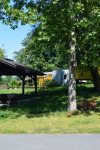 Zwischen den Bauwagen, von Hochbeeten eingerahmt, befinden sich unsere Gruppenplätze. Hier finden zum Beispiel unsere Morgenkreise statt. Zum Schutz vor Regen und Sonne sind diese mit Wetterschirmen ausgestattet.