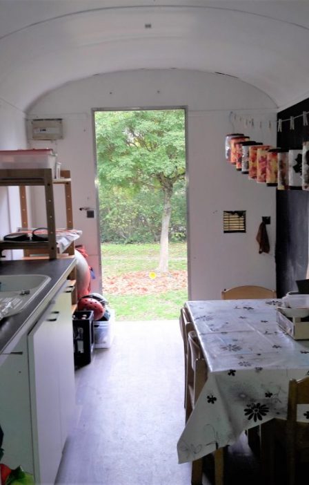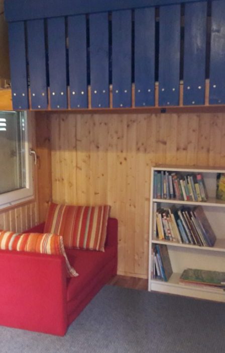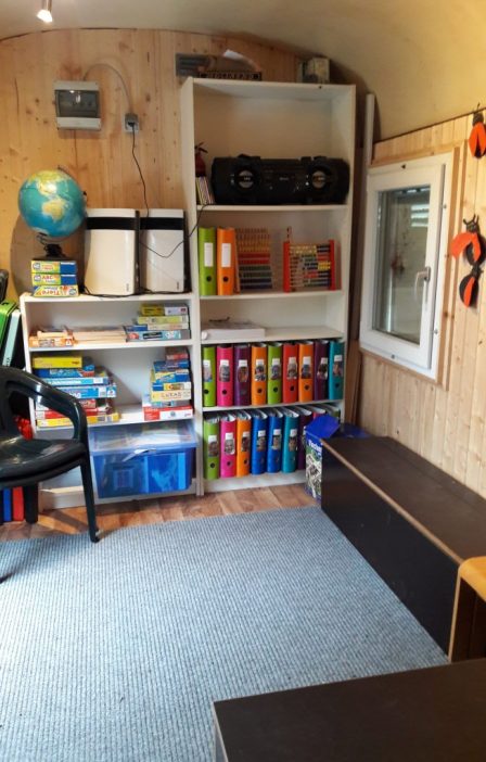 Der „Ruhebauwagen“ soll für die Kinder ein Rückzugsort sein. Besonders die ganz Kleinen brauchen an einem langen Tag an der frischen Luft die Möglichkeit sich auszuruhen und sich zu entspannen. Deshalb gibt es hier eine Leseecke, eine Hochebene mit Schlafmöglichkeit und verschiedene Gesellschaftsspiele. Auch Elterngespräche, Gespräche mit der/dem Kooperationslehrer/in, die Einschulungsuntersuchung, etc. finden dort statt.